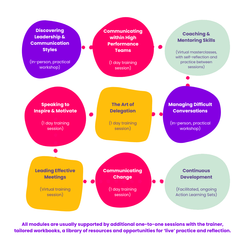 A learning journey that supports your people to develop the communication skills that they need to succeed within their roles. Training, mentoring, self-guided learning, reflection and facilitated sessions all combine to create an environment where your future stars and leaders can excel.